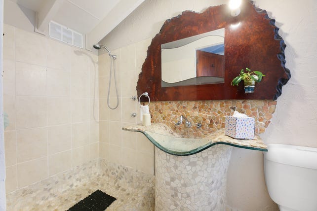 • The main bathroom exudes Tuscan charm with warm tones, rustic textures, and a luxurious spa bath